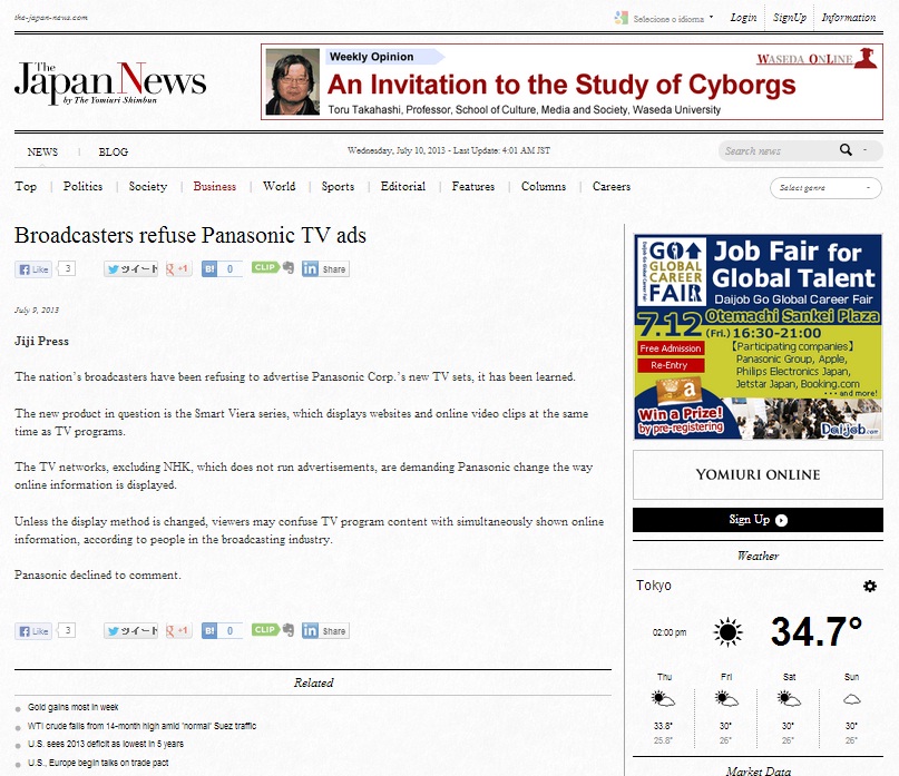 Asahi, Fuji, TBS, e outras gigantes da mídia audiovisual desejam que a Panasonic altere o novo televisor de modo que seus programas apareçam primeiro quando o aparelho for ligado. Segundo a versão online do jornal Yomiuri, todas as redes de televisão recusaram-se a veicular anúncios do lançamento da Panasonic […].
