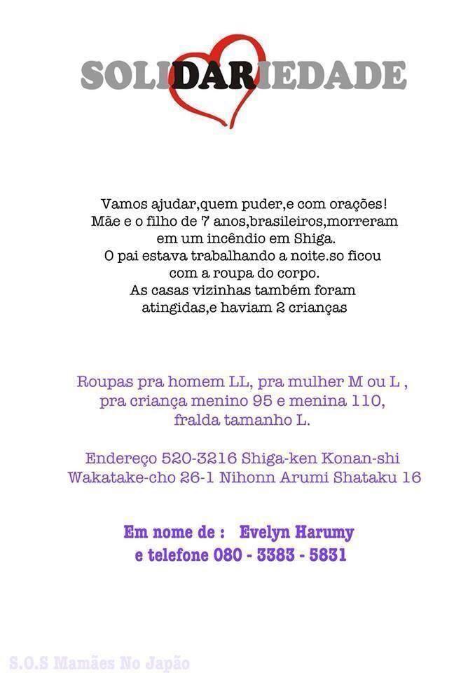 Para doar roupas masculinas tamanho LL, femininas M ou L, para menino tamanho 95, menina tamanho 110 e fraldas tamanho L, contatar Evelyn Harumy pelo telefone 080-3383-5831.